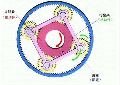 行星輪除了可以繞行星架支承軸旋轉(zhuǎn)外,在有些工況下,還會(huì)在行星架的帶動(dòng)下,圍繞太陽(yáng)輪的中心軸線旋轉(zhuǎn),這就像地球的自轉(zhuǎn)和繞著太陽(yáng)的公轉(zhuǎn)一樣,當(dāng)出現(xiàn)這種情況時(shí),就稱為行星齒輪機(jī)構(gòu)作用的傳動(dòng)方式。