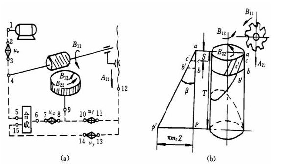 凌機(jī)圓柱斜齒輪表示從傳動(dòng)原理圖a) 可以看出,滾切斜齒齒輪時(shí)必須有四條傳動(dòng)鏈: